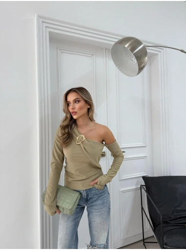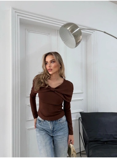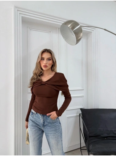 AKSESUAR DETAY OMUZ DEKOLTE BLUZ KAHVE