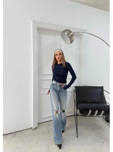 FERMUARLI PARMAK GEÇME DETAY CROP BLUZ LACİVERT