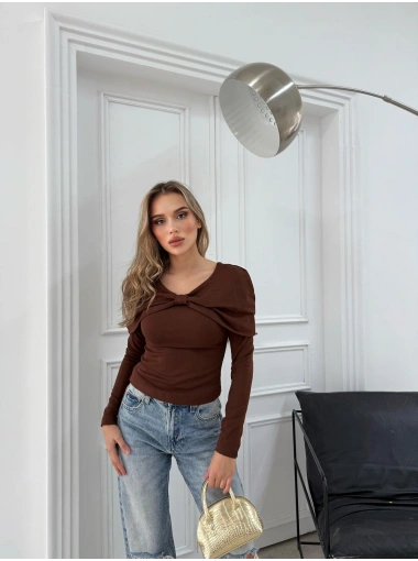 ŞAL YAKA ÖN BURGULU SELANİK KUMAŞ BLUZ KAHVE