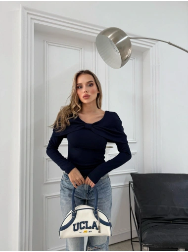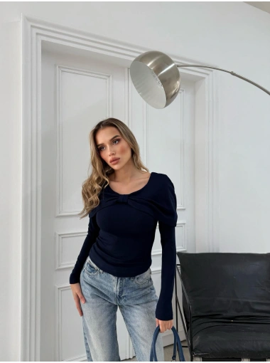 ŞAL YAKA ÖN BURGULU SELANİK KUMAŞ BLUZ LACİVERT