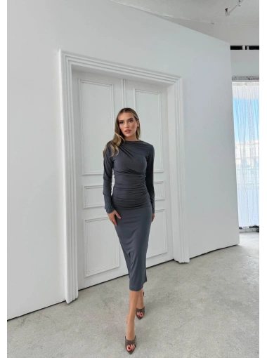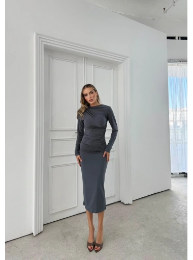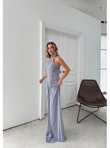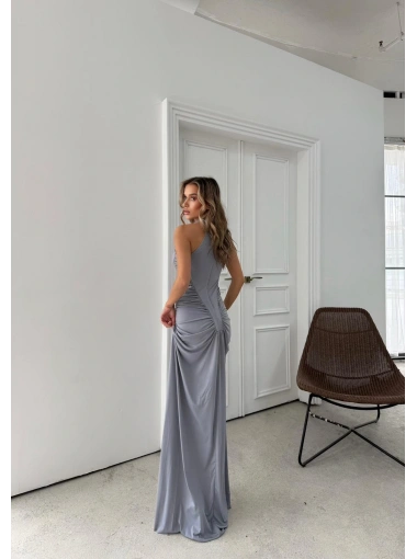 OMUZ VE BEL DRAPELİ UZUN SANDY ELBİSE GRİ