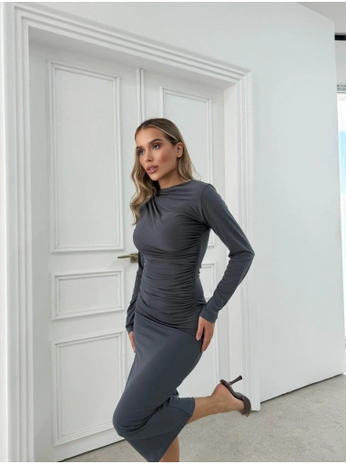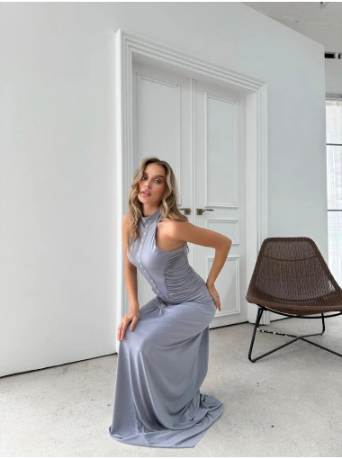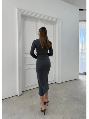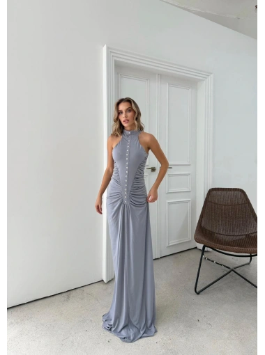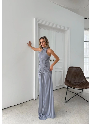 DÜĞME DETAY DRAPELİ UZUN SANDY ELBİSE GRİ