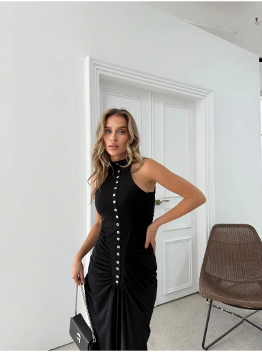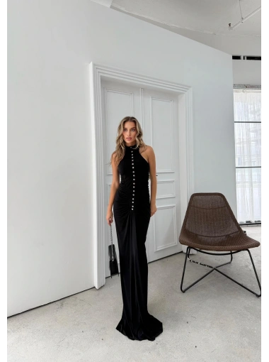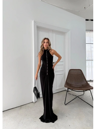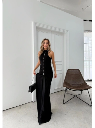 DÜĞME DETAY DRAPELİ UZUN SANDY ELBİSE SİYAH