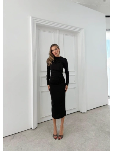 OMUZ VE BEL DRAPELİ UZUN SANDY ELBİSE SİYAH
