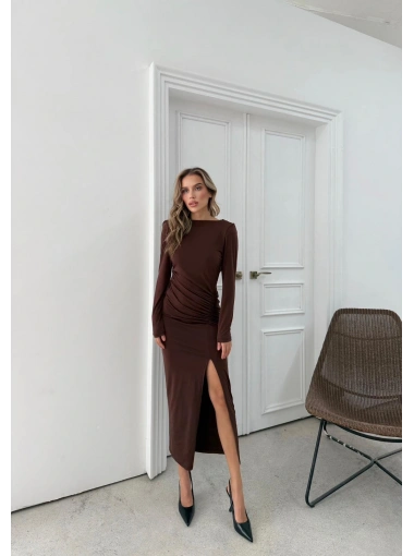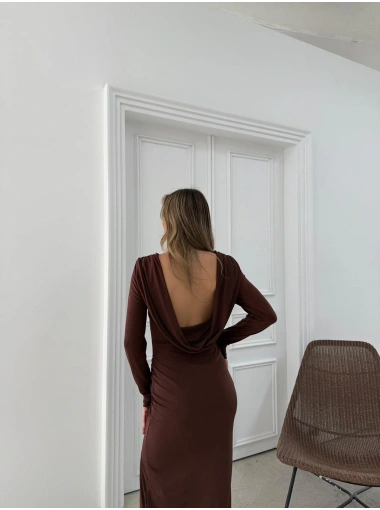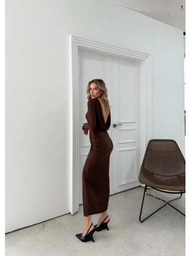 YIRTMAÇLI SIRT DEKOLTE DETAY UZUN SANDY ELBİSE KAHVE SND-5010
