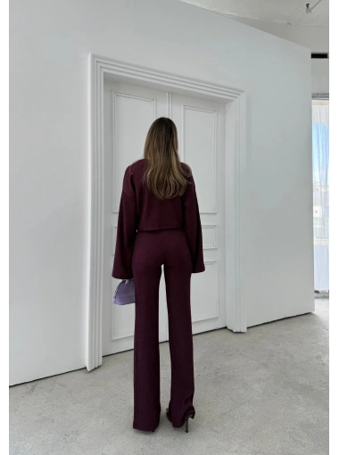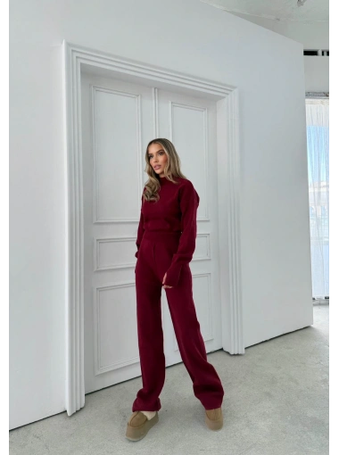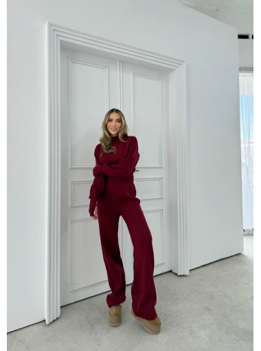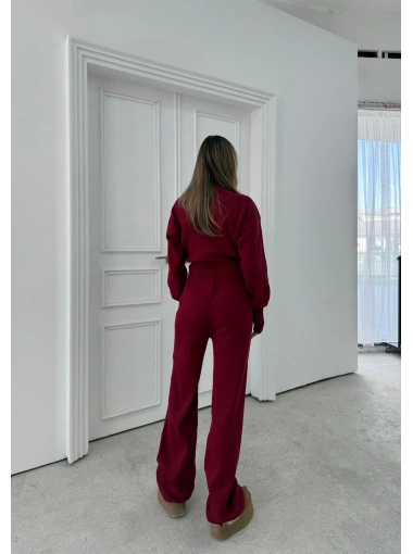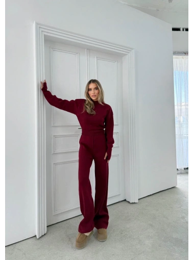 DİK YAKA PARMAK GEÇME DETAY KAZAK VE PANTOLONLU TRİKO İKİLİ TAKIM BORDO