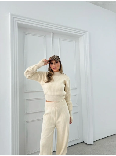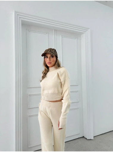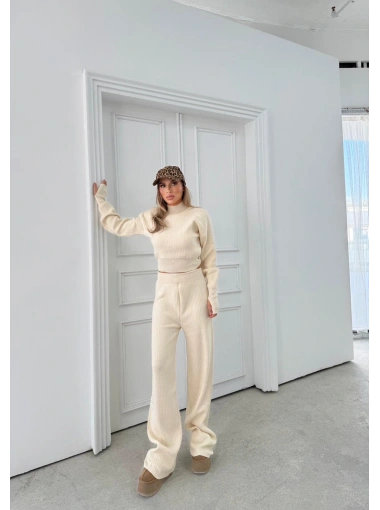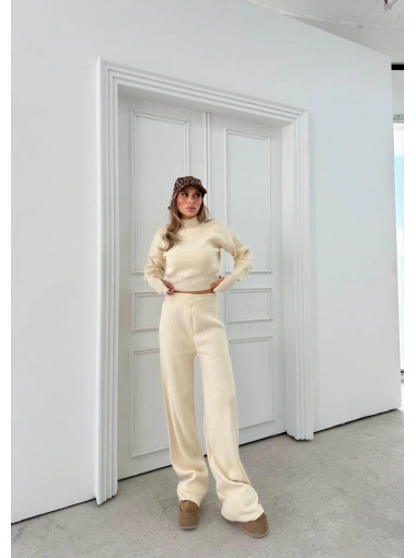 DİK YAKA PARMAK GEÇME DETAY KAZAK VE PANTOLONLU TRİKO İKİLİ TAKIM KREM
