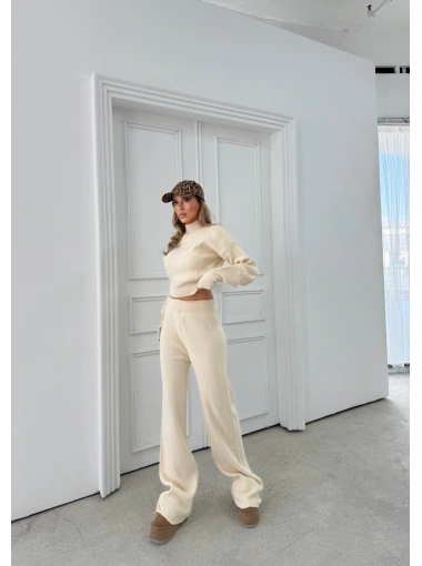 İSPANYOL KOL ÇOBAN DİKİŞ DETAY KAZAK VE PANTOLONLU TRİKO İKİLİ TAKIM KREM