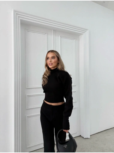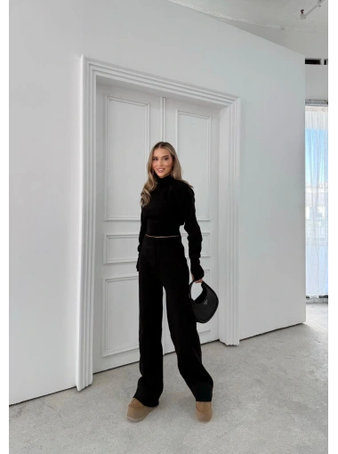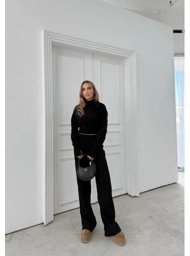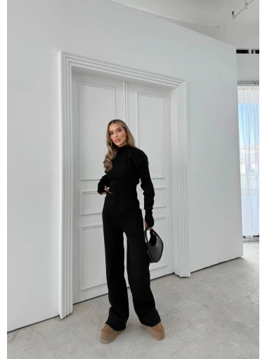 DİK YAKA PARMAK GEÇME DETAY KAZAK VE PANTOLONLU TRİKO İKİLİ TAKIM SİYAH
