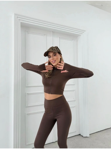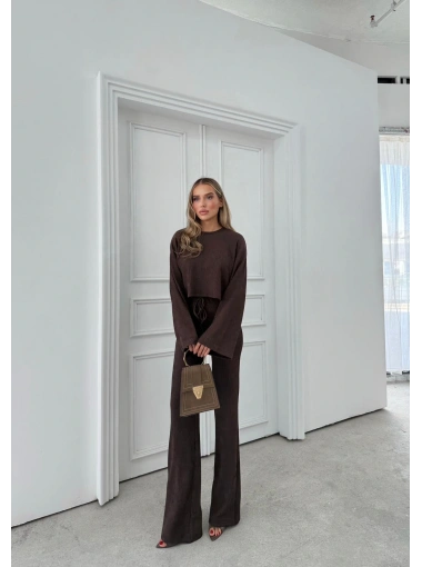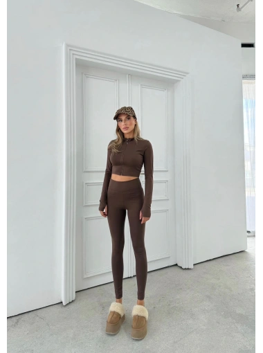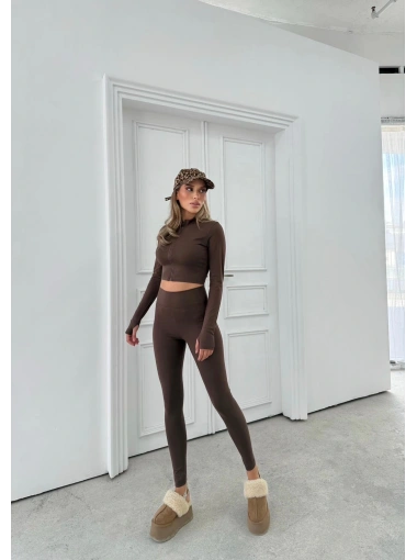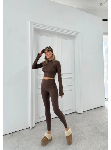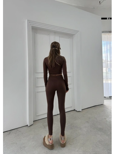 FERMUARLI PARMAK GEÇME DETAY BLUZ VE PANTOLONLU TAYT TAKIM KAHVE