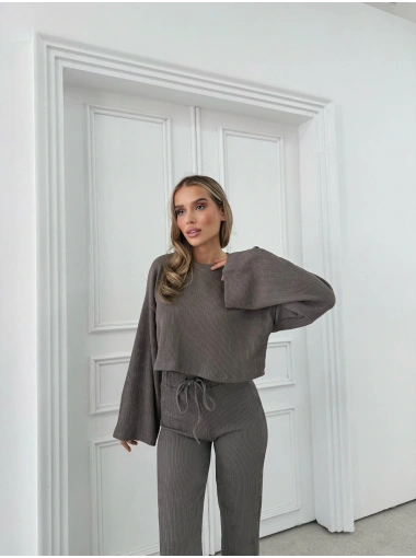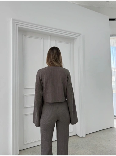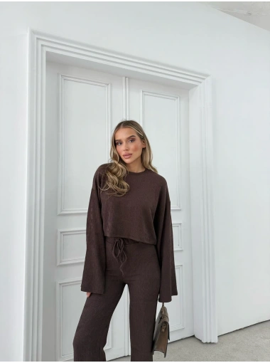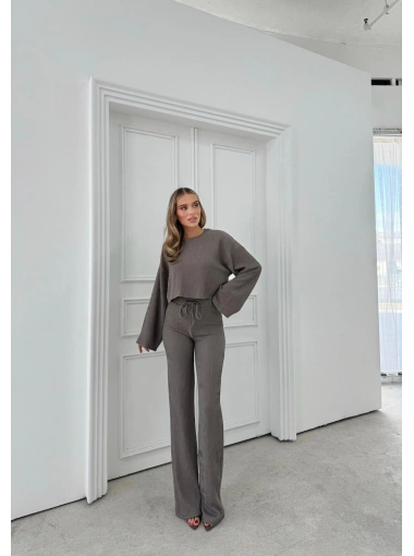 PARMAK GEÇME DETAY TERS DİKİŞ BLUZ VE PANTOLONLU GOFRE İKİLİ TAKIM VİZON
