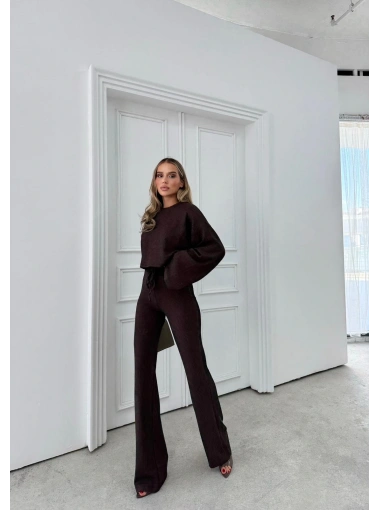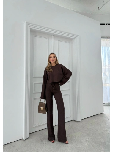 FİTİLLİ İSPANYOL KOL SALAŞ BLUZ VE PANTOLONLU İKİLİ TAKIM KAHVE