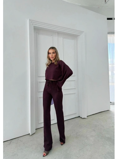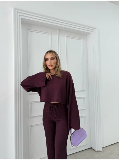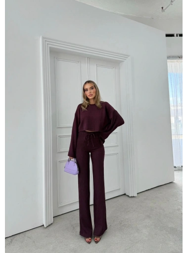 PARMAK GEÇME DETAY TERS DİKİŞ BLUZ VE PANTOLONLU GOFRE İKİLİ TAKIM MÜRDÜM