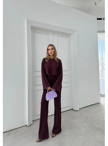 KRUVAZE YAKA BAGLAMA DETAY BLUZ VE PANTOLONLU MODAL İKİLİ TAKIM BORDO