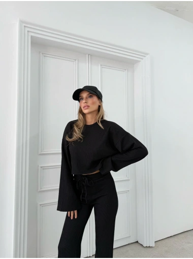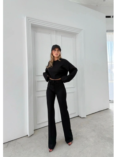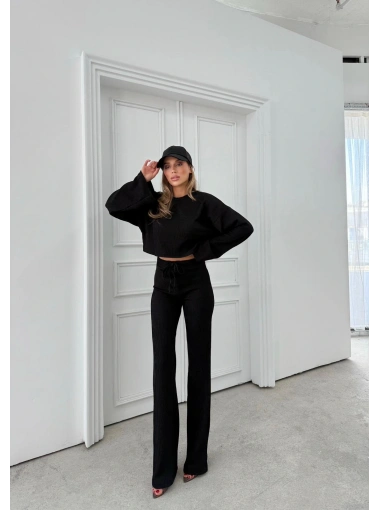 PARMAK GEÇME DETAY TERS DİKİŞ BLUZ VE PANTOLONLU GOFRE İKİLİ TAKIM SİYAH
