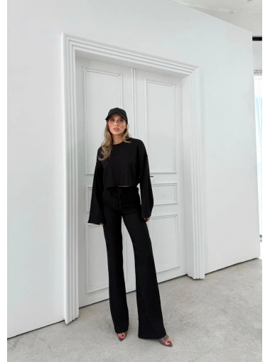 KRUVAZE YAKA BAGLAMA DETAY BLUZ VE PANTOLONLU MODAL İKİLİ TAKIM SİYAH