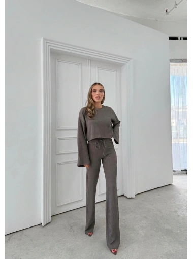 MADONNA YAKA AKSESUAR DETAY BLUZ VE PANTOLONLU GOFRE İKİLİ TAKIM VİZON