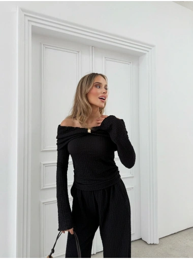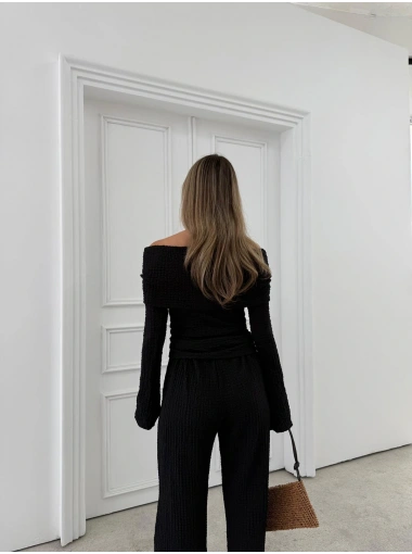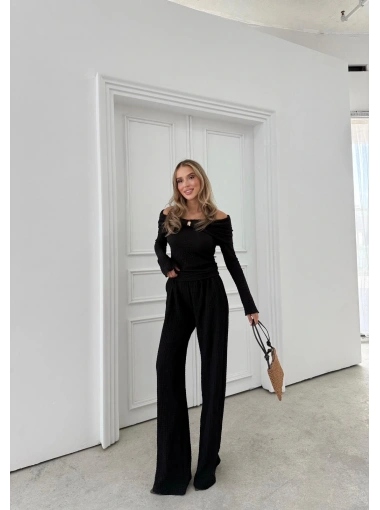BÜZGÜLÜ BLUZ VE PANTOLONLU GOFRE İKİLİ TAKIM SİYAH