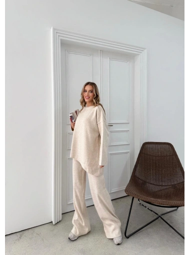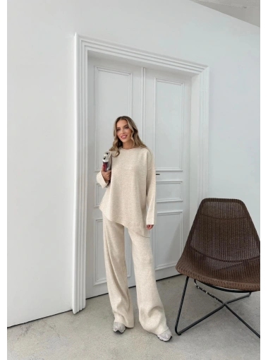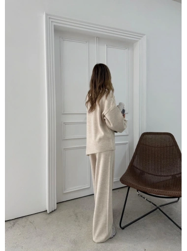 ASİMETRİK DETAY KAZAK VE PANTOLONLU TRİKO İKİLİ TAKIM KREM RY-8010