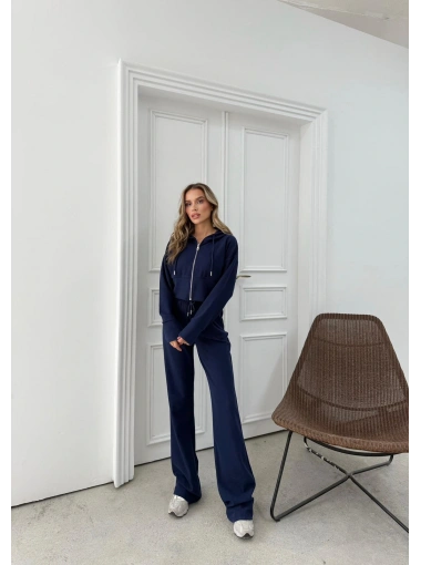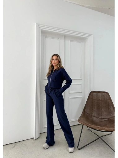 SELANİK KUMAŞ FERMUARLI KAPÜŞONLU HIRKA VE PANTOLONLU İKİLİ TAKIM LACİVERT MNS-3010