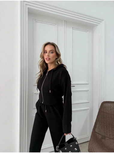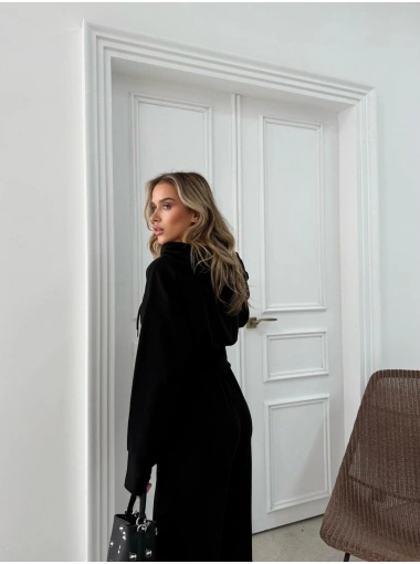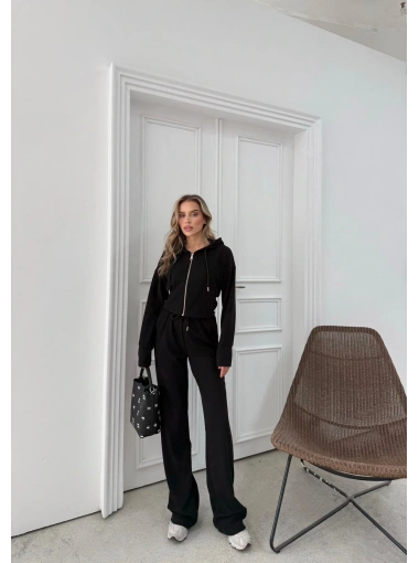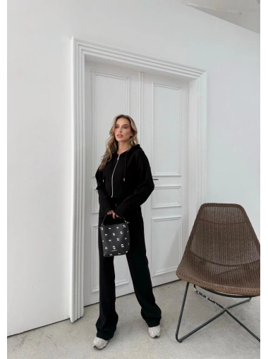 SELANİK KUMAŞ FERMUARLI KAPÜŞONLU HIRKA VE PANTOLONLU İKİLİ TAKIM SİYAH MNS-3010