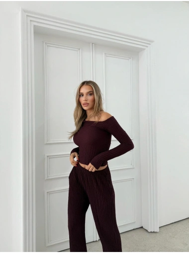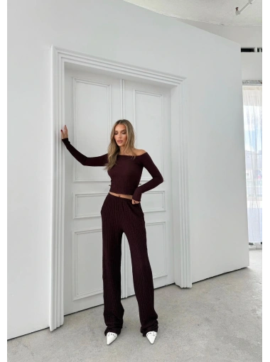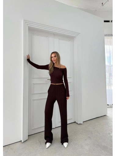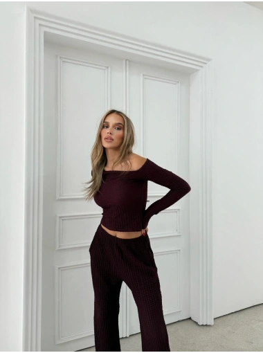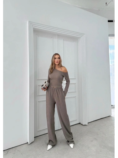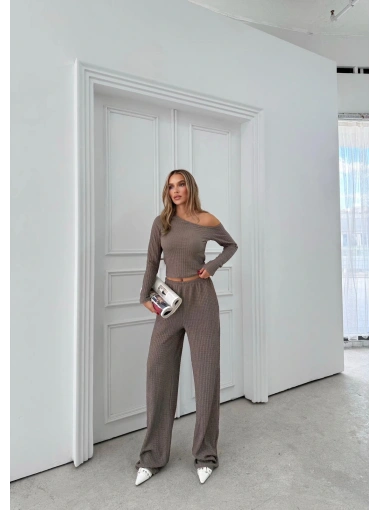 DÜŞÜK OMUZ BLUZ VE PANTOLONLU GOFRE İKİLİ TAKIM VİZON