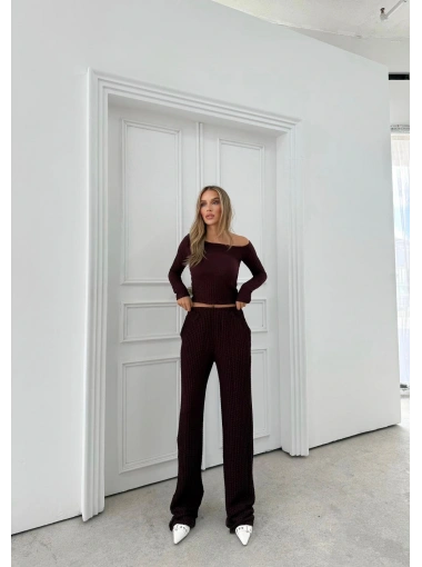 DÜŞÜK OMUZ BLUZ VE PANTOLONLU GOFRE İKİLİ TAKIM BORDO