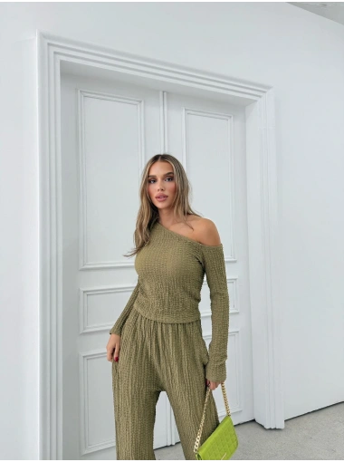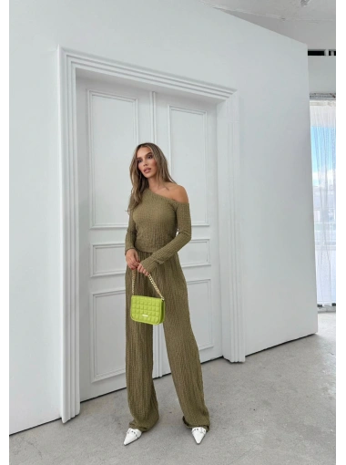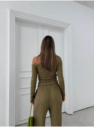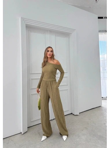DÜŞÜK OMUZ BLUZ VE PANTOLONLU GOFRE İKİLİ TAKIM HAKİ