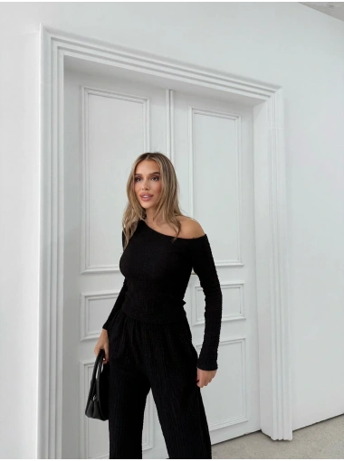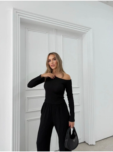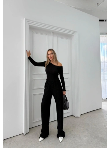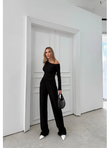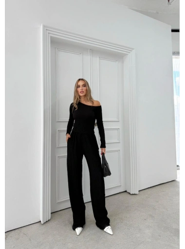DÜŞÜK OMUZ BLUZ VE PANTOLONLU GOFRE İKİLİ TAKIM SİYAH