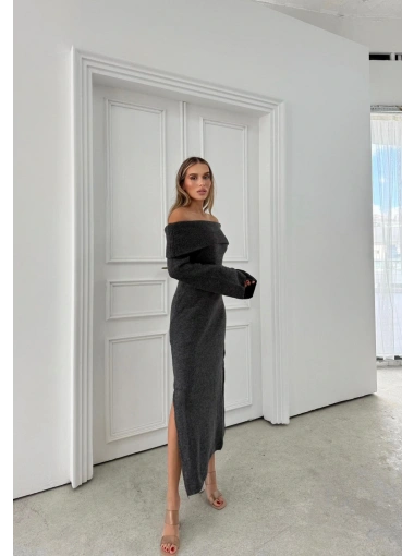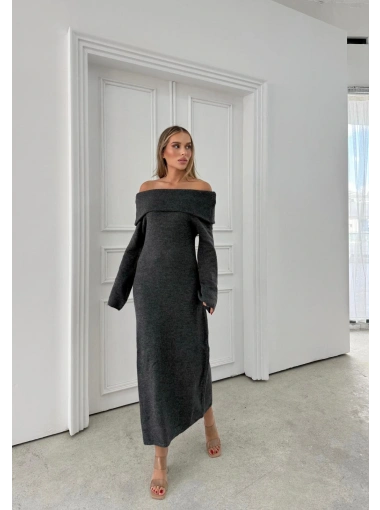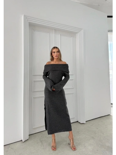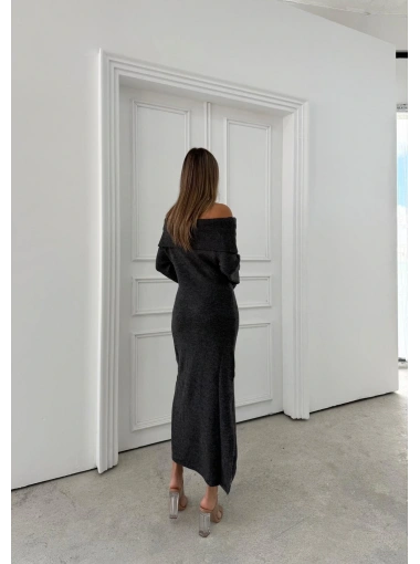MADONNA YAKA YIRTMAÇLI UZUN TRİKO ELBİSE ANTRASİT