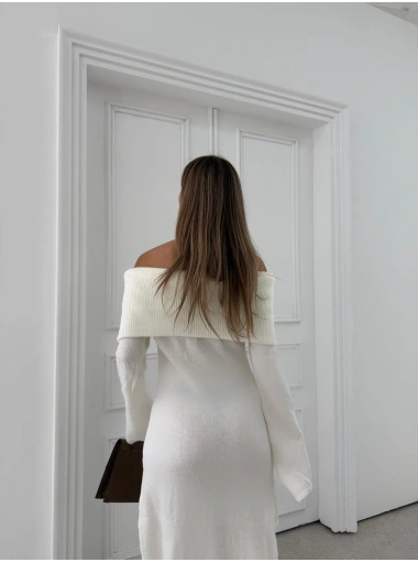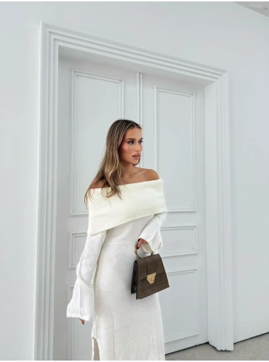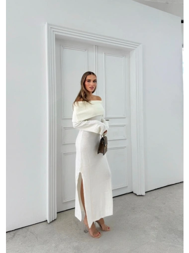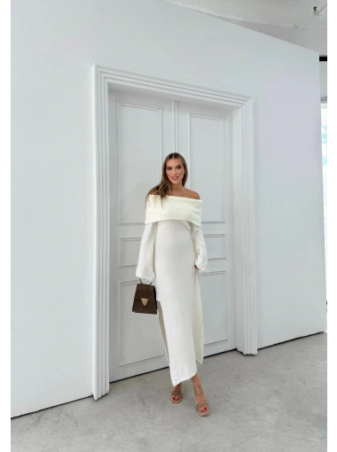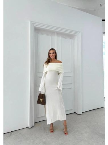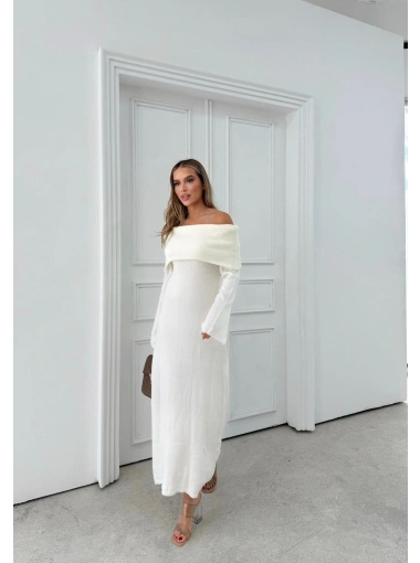 MADONNA YAKA YIRTMAÇLI UZUN TRİKO ELBİSE BEYAZ