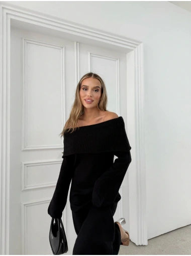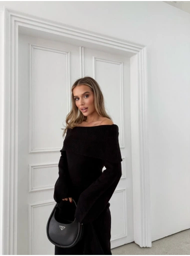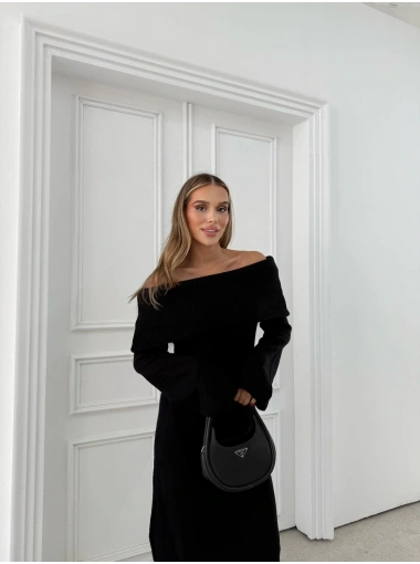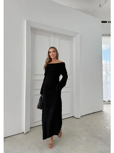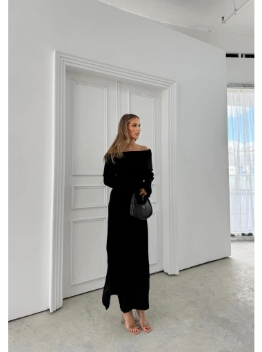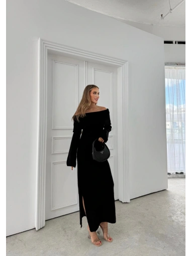 MADONNA YAKA YIRTMAÇLI UZUN TRİKO ELBİSE SİYAH