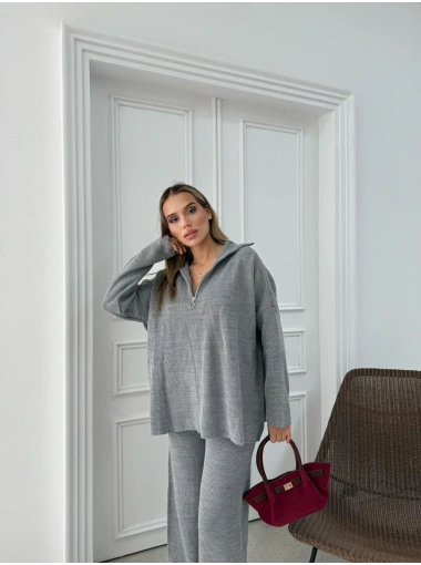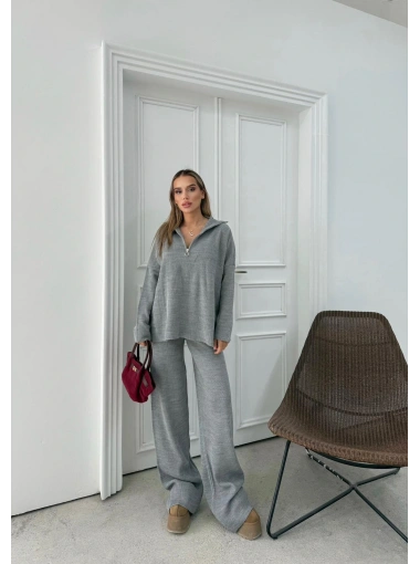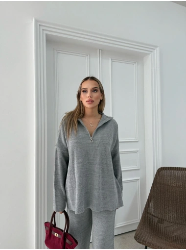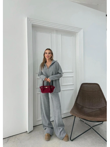 YARIM FERMUAR DETAYOVERSİZE KAZAK VE PANTOLONLU İKİLİ TAKIM GRİ