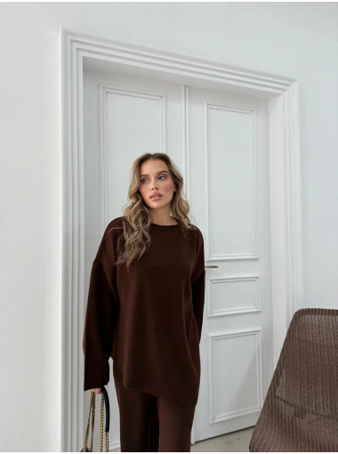 ASİMETRİK DETAY KAZAK VE PANTOLONLU TRİKO İKİLİ TAKIM KAHVE RY-8010