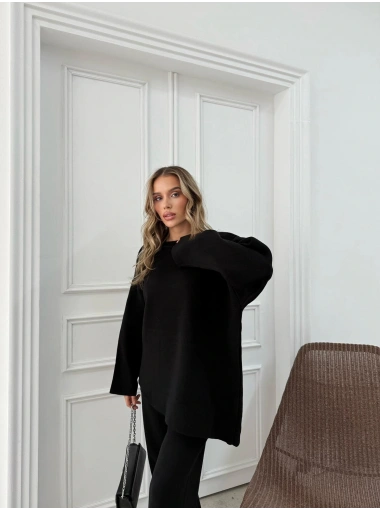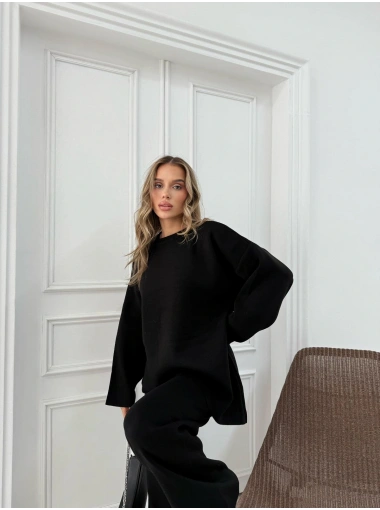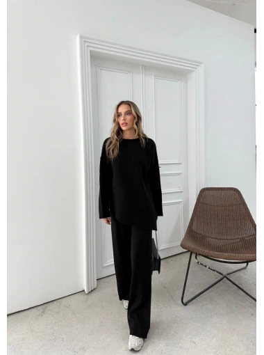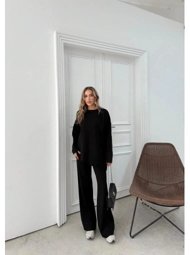 ASİMETRİK DETAY KAZAK VE PANTOLONLU TRİKO İKİLİ TAKIM SİYAH RY-8010