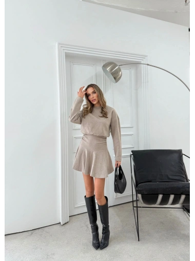BEL BÜZGÜ DETAY ETEK VOLANLI TRİKO ELBİSE BEJ