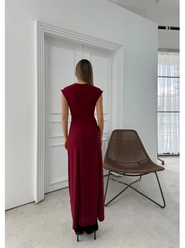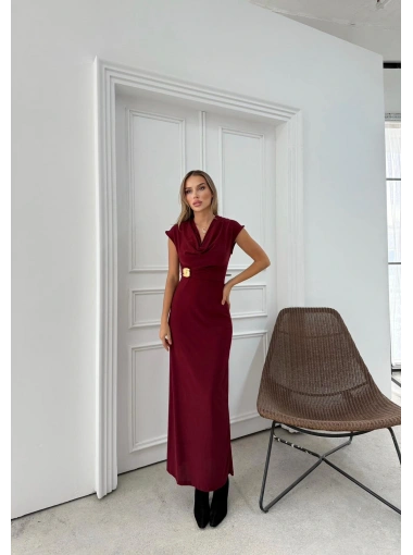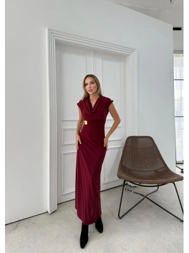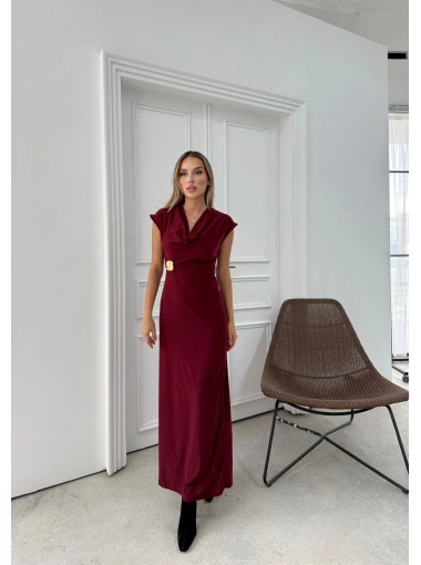 DEGAJE YAKA BEL AKSESUAR DETAY UZUN ELBİSE BORDO
