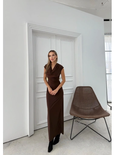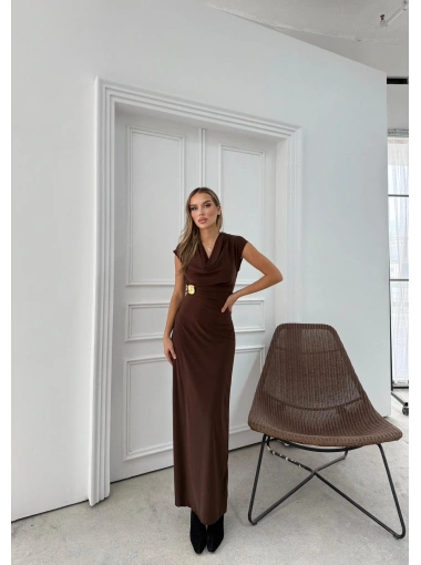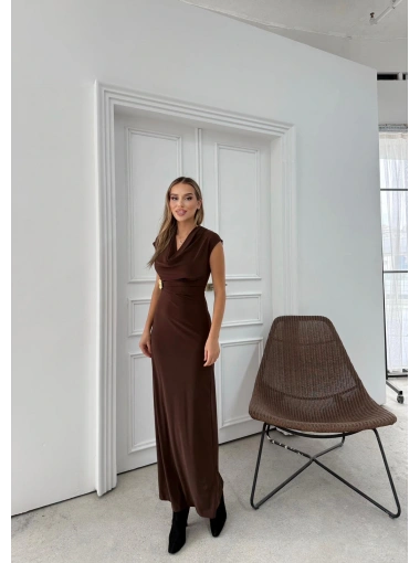 DEGAJE YAKA BEL AKSESUAR DETAY UZUN ELBİSE KAHVE