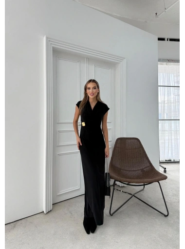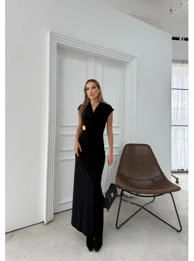 DEGAJE YAKA BEL AKSESUAR DETAY UZUN ELBİSE SİYAH