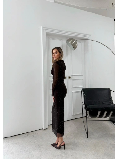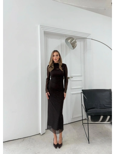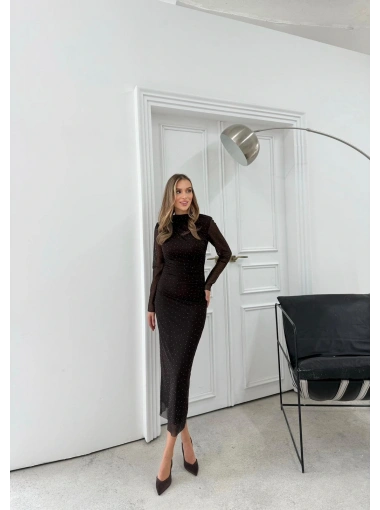 TÜL ASTARLI BEL DRAPE DETAY TAŞLI ELBİSE KAHVE