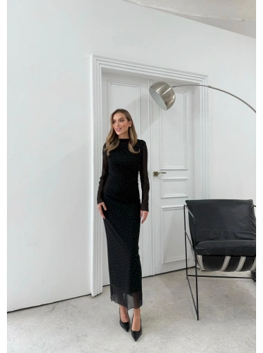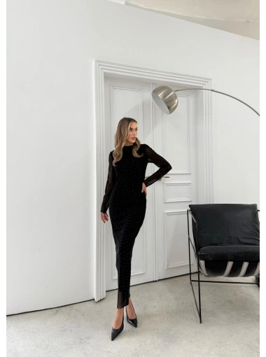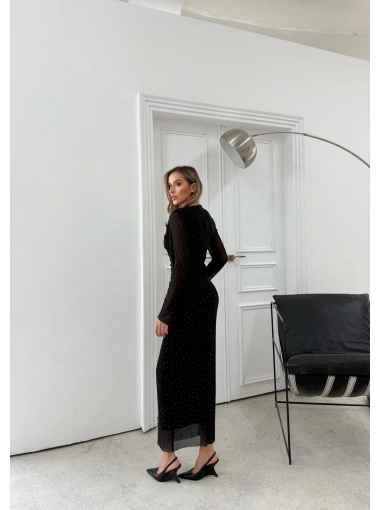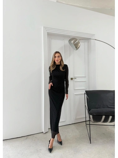 TÜL ASTARLI BEL DRAPE DETAY TAŞLI ELBİSE SİYAH