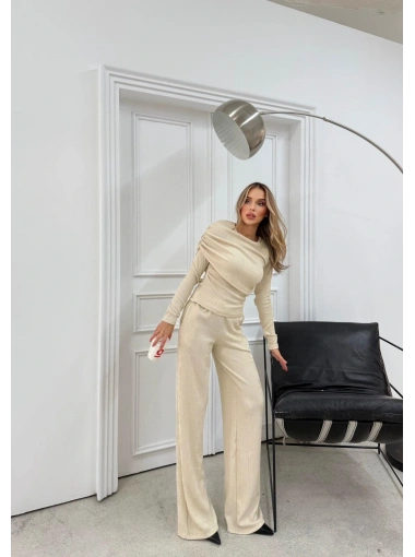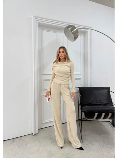 ŞAL YAKA BLUZ VE PANTOLONLU SELANİK KUMAŞ İKİLİ TAKIM KREM