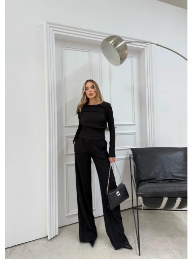 OMUZ DEKOLTE BLUZ VE PANTOLONLU SELANİK KUMAŞ İKİLİ TAKIM SİYAH